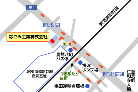 鳥一交差点から鳥飼仁和寺大橋方向へ宮鳥橋南交差点の近くですが反対車線へUターンしにくいので鳥飼基地南交差点まで行っていただいて矢印のような経路でお越しいただくとスムーズに到着いただけます。